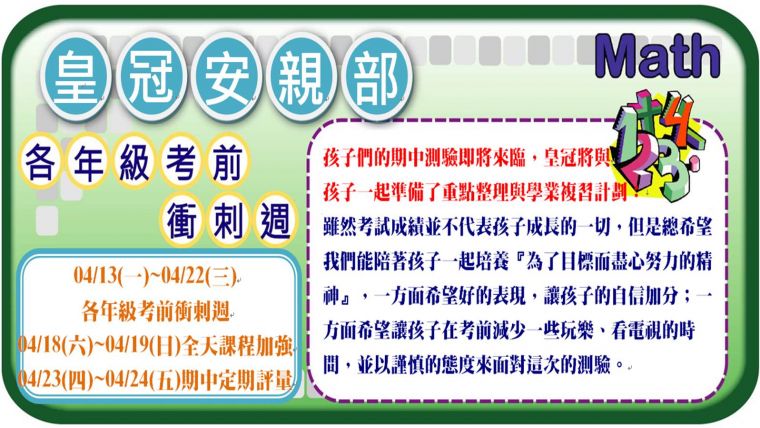 孩子們的期中測驗即將來臨,皇冠將與孩子一起準備了重點整理與學業複習計劃︰雖然考試成績並不代表孩子成長的一切,但是總希望我們能陪著孩子一起培養『為了目標而盡心努力的精神』,一方面希望好的表現,讓孩子的自信加分;一方面希望讓孩子在考前減少一些玩樂、看電視的時間,並以謹慎的態度來面對這次的測驗。