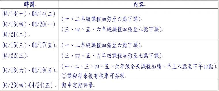 04月安親部各年級考前衝刺週及期中定期評量時間如下: