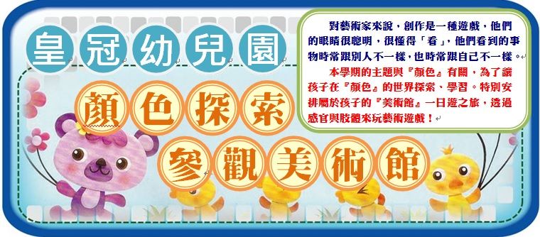 本學期的主題與『顏色』有關,為了讓孩子在『顏色』的世界探索、學習。特別安排屬於孩子的『美術館』一日遊之旅,透過感官與肢體來玩藝術遊戲!